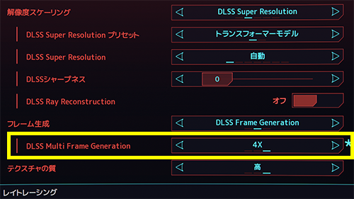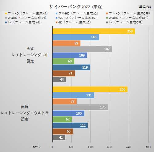 最後に同じくフレーム生成に対応するサイバーパンク2077の結果も見てみたい。同タイトルではDLSS4のマルチフレーム生成機能に対応しているため、今回は2倍(2X)と4倍(4X)でもテストを行った。