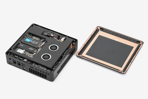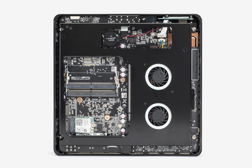 こうした高性能なCPUやGPUを搭載することもあり、冷却機構もなかなか豪華だ。メッシュ構造の天板からは、内部に3基のファンと大きめなヒートシンクが見える。これらのファンを状況に応じて適切に制御することで、CPUやGPUをしっかりと冷却できるようにしているのだろう。後述するグラフを見てもらうと分かるが、コンパクトながら安心して利用できるレベルの冷却性能を備えている。
