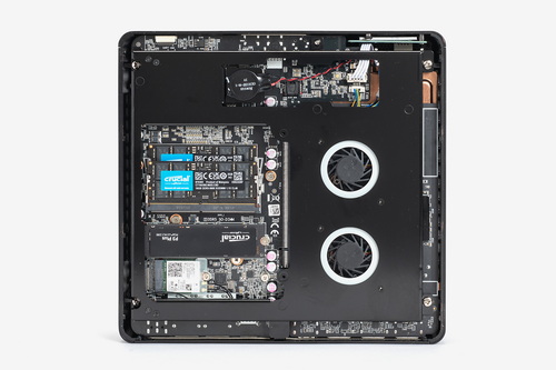なお日本国内においては、本機はメモリやSSDを搭載しないベアボーンPCをベースに、メモリとSSDを搭載し、Windows 11 Proをプリインストールしたカスタマイズモデルを販売する予定だという(メモリやSSDについてはバリエーション展開を行うとのこと)。今回試用した機材は検証用サンプルで、32GBのメモリ(DDR5-5600 SO-DIMM 16GB×2)と1TBのM.2 SSD(PCI Express 4.0 x4接続)がインストールされていた。検証も到着時の状態で行っているが、正式販売開始後は仕様が異なることも考えられるので、その点はご留意いただきたい。