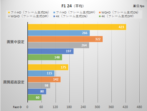 まずはレーシングゲームの「F1 24」。グラフィックス設定をもっとも高い「超高」と平均的な「中」に設定し、平均フレームレート(単位:fps)を比較したものだ。フレーム生成に対応しているタイトルなので、フレーム生成の有無別でも計測している。