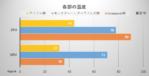 またCPUの負荷が非常に高いCinebench時(=通常のPC利用ではあまりないレベルの高負荷状態)ではごくまれに90℃に達することはあったが、それでも平均的には72℃前後で推移した。