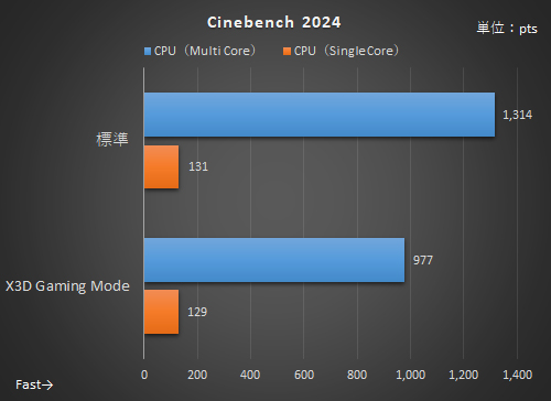 X3D Gaming Modeを有効化すると、8コア8スレッド動作になることが影響してMulti Coreのスコアは落ちてしまう。ゲーム以外のCPUパワーを使う処理を行うときは無効化しておいたほうがよいだろう。では、実際のゲームではどうなのか。