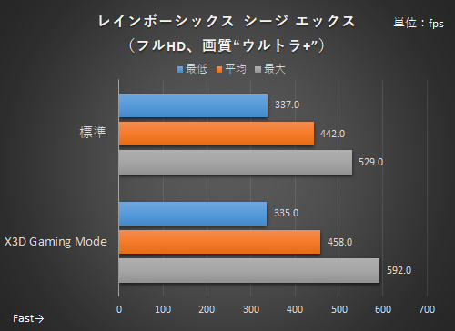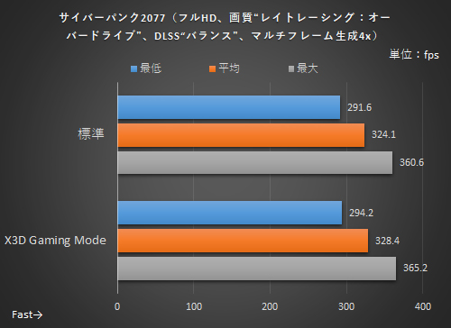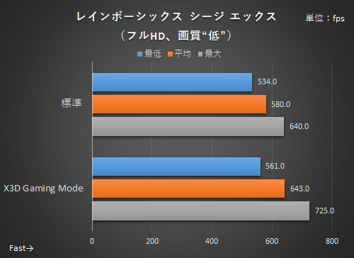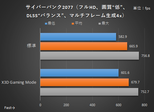 いずれもX3D Gaming Modeを有効化するとフレームレートの向上を確認できた。特にレインボーシックス シージ エックスの低画質では平均フレームレートが約11%アップ。CPUパワーの影響を受けやすい設定では伸び率が高い傾向にあるようだ。サイバーパンク2077も低画質のほうがフレームレートが向上している。超高リフレッシュレートのモニターと組み合わせ、少しでもフレームレートを高めたいという用途ではよさそうだ。
