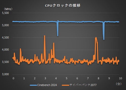 CPUの使用率が100%になるCinebench 2024では公称ブーストクロックの5.2GHzに近い5.15GHz前後で安定。CPU性能を安定して引き出せているのが分かる。2カ所クロックが落ちている地点があるが、これはベンチマークのアイドリングが発生しているため。サイバーパンク2077はゲーム状況によってCPU負荷が変わるため変動が激しい。