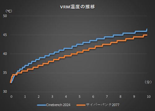 VRMは負荷の高いCinebench 2024で最大46.5℃、最大クロックには到達しないサイバーパンク2077では最大45℃となった。まったく問題なく冷えている温度で、CPU負荷の高いCinebench 2024でもサイバーパンク2077と大差はなく、高負荷の状態が続いても安心と言ってよいだろう。
