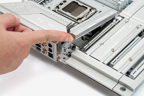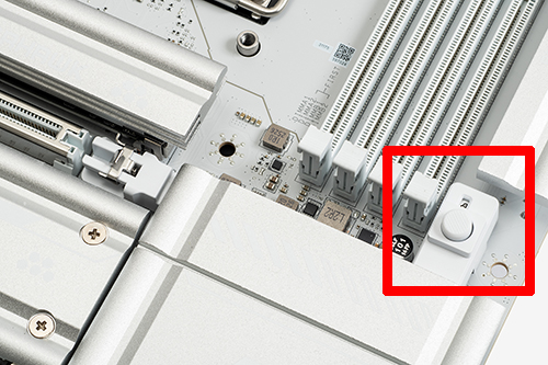 CPUに一番近いPCI Express 5.0 x4のM.2スロットはワンタッチでヒートシンクを着脱できる「EZ M.2 Shield Frozr II」を採用。SSDをスロットに挿して押し込むだけで固定を完了できる「EZ M.2 CLIP II」も備えており、ツールレスで作業が可能だ。EZ M.2 CLIP IIは先端がスティックのようになっていて“倒すだけ”でロックを解除できるため、SSDの取り外しも簡単だ。