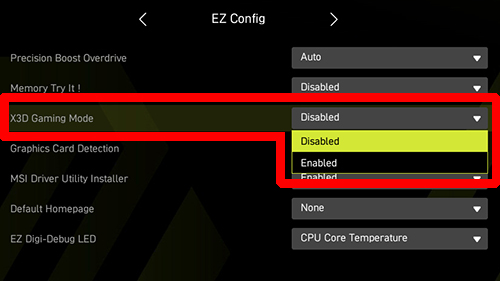 UEFIメニューの中で、X3D系のCPUとの組み合わせで注目したいのが「X3D Gaming Mode」だ。CPUコアの機能の一部やSMT(同時マルチスレッド)の設定を調整してゲームのパフォーマンスを向上させるというもの。有効にすると8コア16スレッドが8コア8スレッド動作に変化するのでSMTを無効化していると見られる。