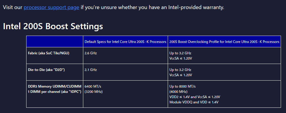 Intel 200S Boostとは、Core Ultra 200S シリーズのKモデル向けに提供されているIntel公式オーバークロックプロファイルだ。搭載しているメモリモジュールが1チャネルあたり1枚(1DPC/1 Dimm per Channel)でXMPに対応している場合、DDR5-8000以下かつ動作電圧1.4V以下という制限の範囲内でXMPに基づくメモリオーバークロックが有効化され、CPU内部のインターコネクトも高速化される。