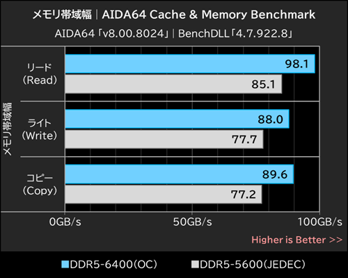 DDR5-6400のメモリ帯域幅は88.0~98.1GB/sとなっており、DDR5-5600の77.2~85.1GB/sを13~16%ほど上回った。メモリスピードが向上した分だけ、メモリ帯域幅もしっかり増加しているようだ。