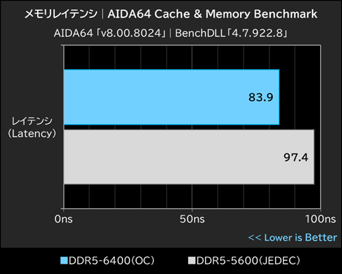 スペック上のCASレイテンシ(CL)を比較すると、DDR5-5600のCL46が約16.4ナノ秒であるのに対し、DDR5-6400のCL32は約10.0ナノ秒であり、メモリ側でのレイテンシがかなり削減された結果であることがうかがえる。