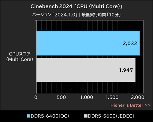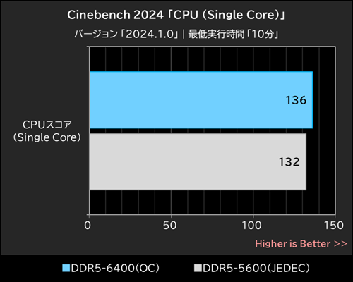 DDR5-6400は、マルチコアで約4%、シングルコアでも約3%、DDR5-5600が記録したスコアを上回った。