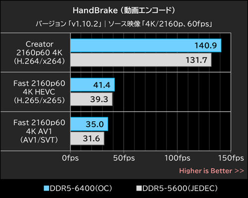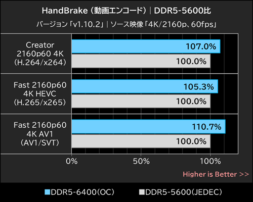DDR5-6400のエンコード速度は、H.264で約7.0%、H.265で約5.3%、AV1で約10.7%、いずれもDDR5-5600を上回った。CPUを用いた動画エンコードはメモリ性能が反映されやすい処理のひとつではあるが、それにしても大きな差がついた印象だ。