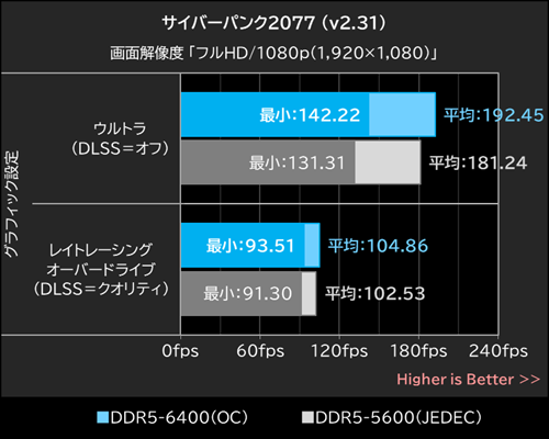 ゲームにおいて、メモリ性能向上の恩恵はGPU以外の要素によってフレームレートが頭打ちになっている時間が長いほど大きくなる。実際、今回のテストでもGPU負荷の高いレイトレーシング:オーバードライブよりウルトラの方がメモリ性能向上の恩恵が大きい様子が見て取れる。