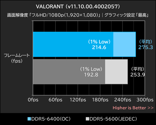 DDR5-6400で計測されたフレームレートは平均が275.3fpsで、1% Lowは214.6fpsだった。DDR5-5600の平均は253.9fps、1% Lowは192.8fpsであり、DDR5-6400は平均で約8.4%、1% Lowで約11.3%、それぞれDDR5-5600のフレームレートを上回った。