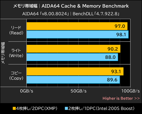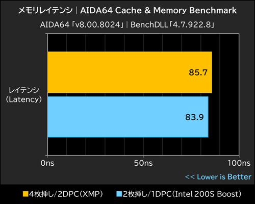 4枚挿しでのメモリ性能を計測した結果は、2枚挿しでIntel 200S Boostを適用した際のパフォーマンスと遜色ないものであり、枚数が増えたことでメモリのランク数やバンク数が増えるため帯域幅に関しては若干増加している様子もみられた。