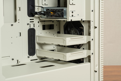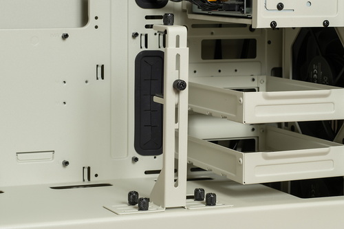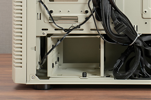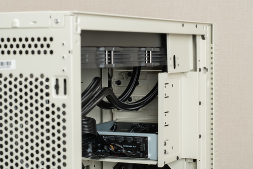 ただ、こうしたレトロな外観のFLP02の内部には、高性能なパーツを組み込むための工夫が凝らされている。前面近くには2.5/3.5インチデバイスに対応するシャドーベイトレイを装備するが、このトレイは簡単に着脱できる構造になっており、最大で38.6cmの大型ビデオカードを組み込める。また大型で重量のあるビデオカードを支えるためのビデオカードホルダーも標準で備えている。