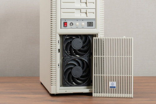 FLP02の一番すごいところは、振り切ったと言えるほどのレトロなデザインだ。オフホワイトを基調にした色合い、多数のスリットを設けて中央部にはLEDディスプレイを表示する前面パネルは、1990年代前半に主流だったPCケースの特徴そのものである。