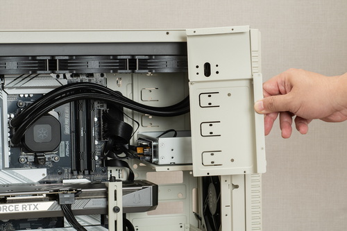 また前面上部には5インチベイがあり、固定された状態だと36cmクラスの簡易水冷型CPUクーラーのラジエーターやファンが入らない。そのため5インチベイを左右から固定しているネジを外し、左側面に若干引き出してずらし、ラジエーターとファンを押し込んだ。