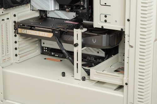 ラジエーターやファンがマザーボード上部にかぶることもないので、各種ケーブルの接続や引き回しは容易に行える。またビデオカードホルダーはビデオカードを受けるトレイだけではなく、ビデオカードの幅に合わせて固定する位置を移動できるタイプだ。組み込むビデオカードに合わせて、適切な場所に移動しよう。