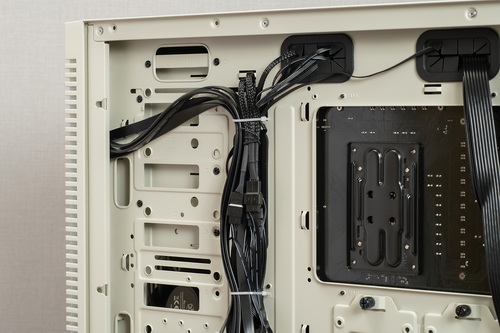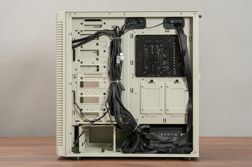 マザーボード裏側のケーブル配線用のスペースは、実測値で約2cmだった。要所に装備している面ファスナーを使い、ケーブルを薄くまとめて厚みが出ないようにすれば、右側板が固定できなくなることはない。