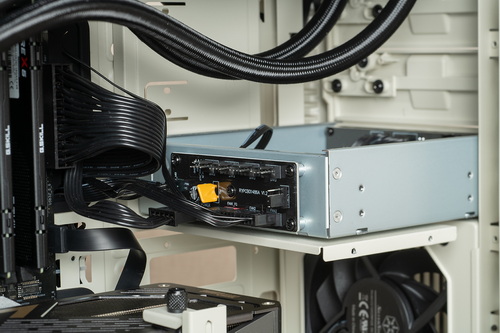 前面のファンコンに見える部分は、厳密にはファンコンではなくファンハブだ。最大8基までのファンを制御できるファンコネクターを装備しており、標準で装備する3基分のファンは出荷時点で接続されている。このファンハブに電源ユニットからのSerial ATA電源ケーブルを接続し、マザーボードのファンコネクターにファンハブからのファンケーブルを接続する。一般的なファンコントローラーのように独立して機能するものではないことに注意したい。