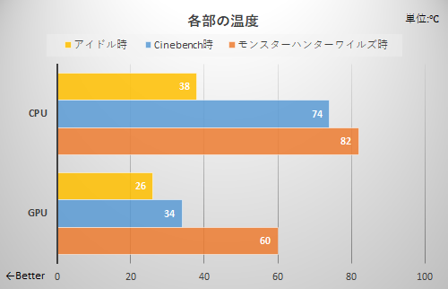 CPU温度は、Cinebench時で74℃、モンスターハンターワイルズ時で82℃という結果になった。側板がフラットで、主な吸気口となる前面パネルはすべての領域が開口部になっているわけではないことを考えると、なかなか健闘した結果と言ってよく、十分冷えている。