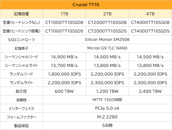 まずは、今回の主役であるCrucialのPCIe 5.0 SSD「T710」の仕様を確認しておこう。