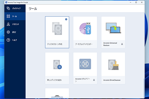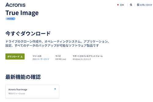 T710をはじめ、CrucialのSSDにはAcronis True Image for Crucialの使用権が付帯しており、Crucialのウェブサイトを経由してソフトウェアをダウンロードすれば、OSを丸ごと移行できるディスククローン機能を無料で利用することができる。