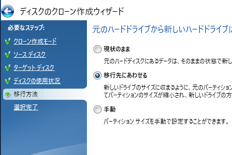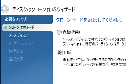 ディスクのクローン作成ウィザードが起動するので「手動」を選択し、ソースディスクに現在使用中のシステムSSD(P5)、ターゲットディスクに乗り換え先のSSD(T710)を設定。その後、ディスクの使用状況を「このコンピューターのディスクを交換」、移行方法を「移行先にあわせる」に設定し、ディスククローンの作成を実行しよう。