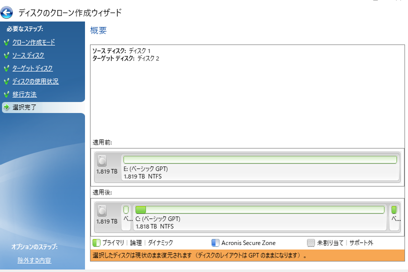 デバイスの暗号化が解除されていることを確認したら、Acronis True Image for Crucialを起動して「ディスクのクローン作成」をクリックする。
