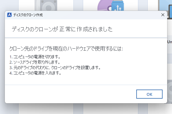 ディスククローンの作成が完了したらPCの電源を切り、古いSSDを取り外して新しいSSDと交換する。これでシステムSSDの乗り換え作業は完了だ。