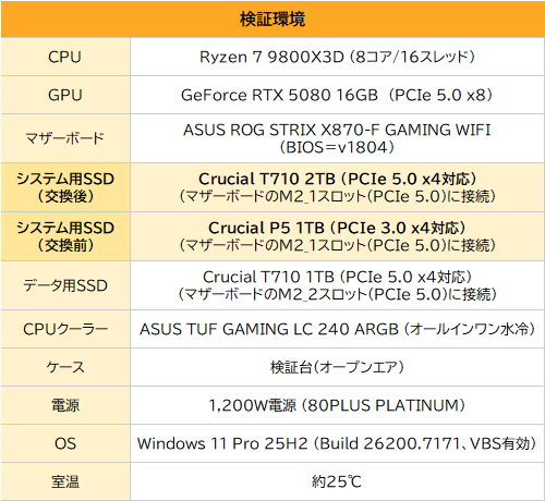 テストに使用するのは先ほどのAcronis True Image for CrucialでSSDの乗り換えを行ったシステムで、PCIe 3.0 SSDのP5(1TB)からT710(2TB)に乗り換える前後のパフォーマンスを比較する。システムSSD以外のパーツ構成は以下の表のとおり。
