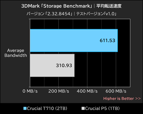 次に紹介するのは、SSDやHDDをゲームインストール用として利用した場合のパフォーマンスを計測する3DMarkの「Storage Benchmark」の計測結果だ。今回は性能を数値化したベンチマークスコアのほか、平均転送速度(Average Bandwidth)と平均アクセス時間も比較した。