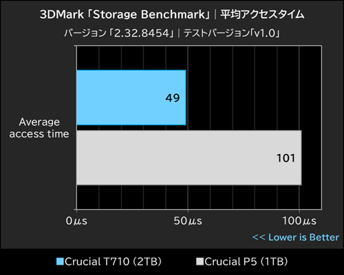 T710のベンチマークスコアは3,617で、P5が記録した1,796の約2倍に達している。平均転送速度についてもT710がP5の約2倍となっており、T710の平均アクセス時間はP5が記録した101マイクロ秒の半分以下となる49マイクロ秒だった。