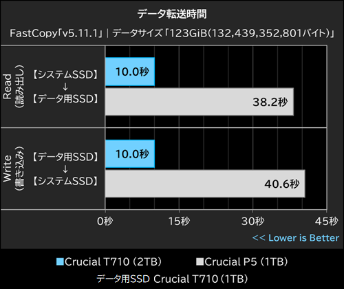 T710が123GiBのファイル転送に要した時間は、読み出し/書き込みともに約10.0秒だった。PCIe 3.0 SSDのP5は、読み出しで約38.2秒、書き込みに約40.6秒を要しており、PCIe 5.0 SSD同士でのファイル転送が実現する圧倒的な速度がうかがえる。