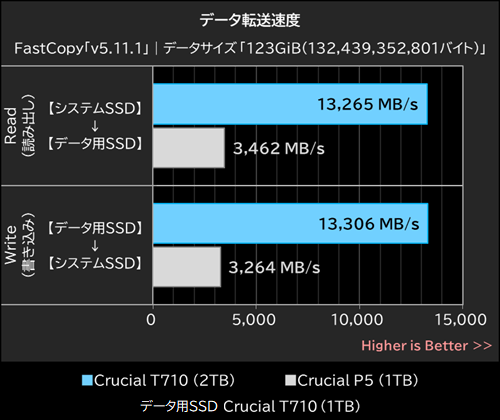 データ用SSDとして搭載したT710(1TB)モデルとの間で、ファイルサイズ123GiB(132,439,352,801バイト)の大容量ファイルの転送を行った際の転送時間と転送速度を比較する。
