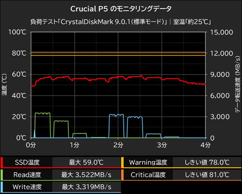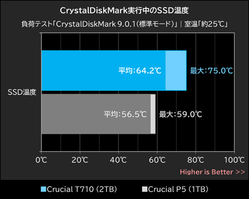 PCIe 3.0 SSDのP5と比較すると高い温度になってはいるが、マザーボードのSSD用ヒートシンクによる放熱だけでも安定して高いパフォーマンスを維持できる程度の発熱量であり、従来のPCIe 5.0 SSDより大幅に扱いやすくなっている。