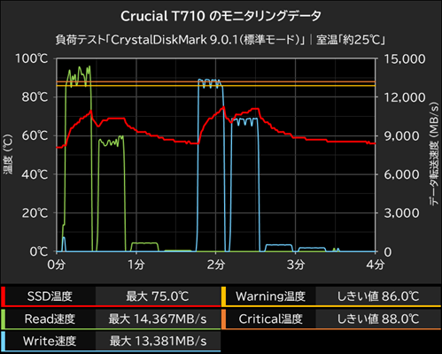 今回SSDのテスト用に構築したテスト環境は、マザーボード付属のSSD冷却用ヒートシンクを搭載してはいるものの、冷却ファンによる風の影響が全くないパッシブクーリング状態なのだが、T710のSSD温度は最大75.0℃(平均64.2℃)で、サーマルスロットリングが作動する86℃を大きく下回った。
