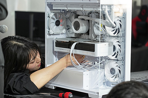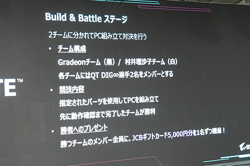 声優・MCとして活動している村井理沙子さん、PCパーツ系YouTuberのgradeon氏、プロesportsチーム「QT DIG∞」のメンバーをゲストに招き、ゲーミングPCの組み立てを実演しつつ、チーム対抗戦で組み立ての早さを競争。イベントの後半では、組み立てたゲーミングPCを使ったゲーム大会も行われた。