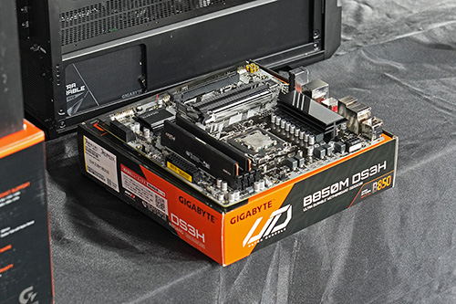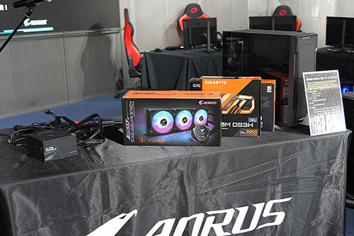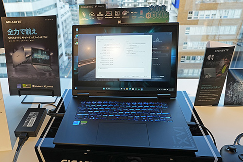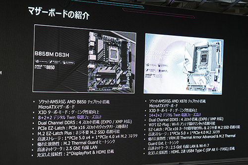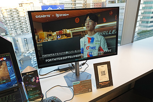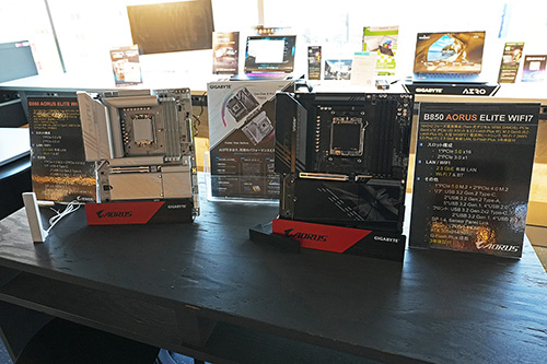 会場にはB850M AORUS ELITE WIFI7 ICE-P以外にも複数のGIGABYTE製品を展示。「B860 AORUS ELITE WIFI7 ICE」、「B860 AORUS ELITE WIFI7」、「B850M D3HP」、「X870I AORUS PRO ICE」といったマザーボードや、有機ELパネル採用のゲーミングモニター「MO27Q28G」、ゲーミングノートの「AORUS MASTER 16」、「AERO X16」、「GAMING A16」などが振られれる状態で展示されていた。