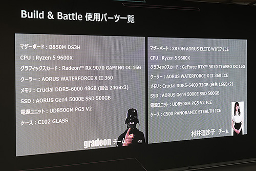 村井理沙子さんのチームは白いPCパーツ中心、gradeon氏のチームは黒いPCパーツが中心の構成となっており、どちらのチームもRyzen 5 9600XをCPUに使ったSocket AM5環境の構成となっていた。