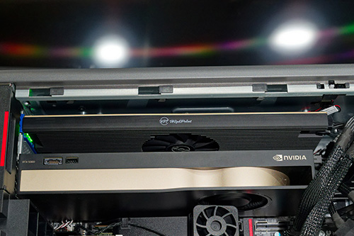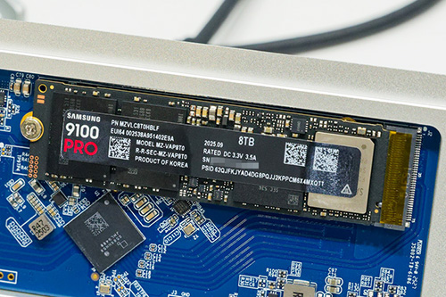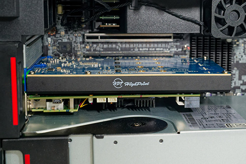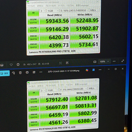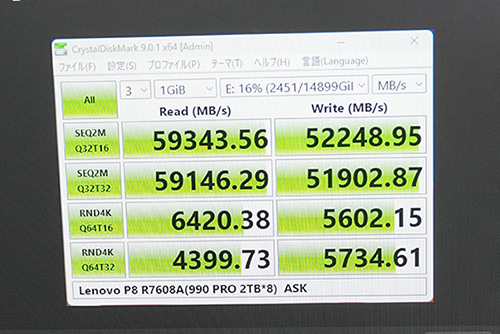FastCopyのデモ環境は、96コアのAMD Ryzen Threadripper PRO 7995WX搭載マシンにHighPoint製RAIDカードを2基装着し、そこにPCIe 5.0のNVMe SSD「Samsung 9100 PRO 8TB」を4枚と「Samsung 990 PRO 4TB」を8枚、贅沢に載せたLenovo ThinkStation P8。
