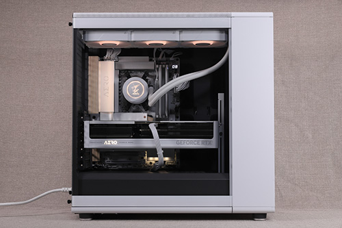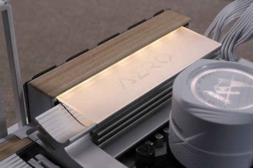 実際に組みあがったPCの写真を以下に掲載する。X870E AERO X3D WOODが備える電球色系のLEDライティングと他のパーツのLEDカラーを合わせることで、木目調パネルのイメージとよくマッチする温かみのあるライティングを実現できた。