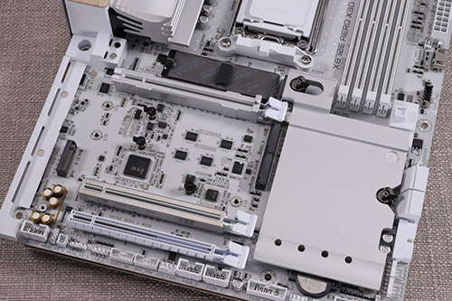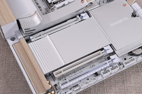 拡張スロットとしてPCIe x16形状のスロットを3本搭載。CPUソケットに近い側からPCIe 5.0 x16、PCIe 5.0 x8、PCIe 4.0 x4での接続に対応。PCIe 5.0に対応するスロット2本はCPUが提供するPCIe 5.0 x16レーンを共有しており、PCIe 5.0 x8対応スロット使用時は2本とも最大x8接続が上限となる。