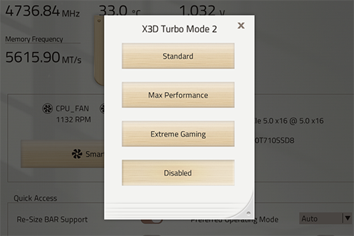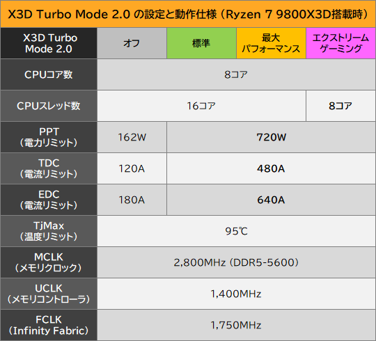 なお、各動作モードにおいてCPUの基本的な動作設定は以下のように変化した。X3D Turbo Mode 2.0を有効にしてもメモリやそれに連動するUCLK/FCLKに変化がない一方、CPUのリミット設定であるPPTやTDC/EDCはPBO(Precision Boost Overdrive)有効時と同水準まで引き上げられた。また、エクストリームゲーミング設定ではSMTが無効になり、CPUスレッド数が16から8に減少した。