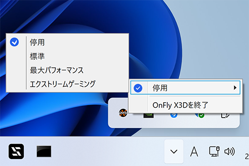 X870E AERO X3D WOODでは、X3D Turbo Mode 2.0はデフォルトで「オフ(Disabled)」に設定されており、任意で3種類の動作モードを選択できる。X3D Turbo Mode 2.0の設定はBIOSメニューで行えるほか、「OnFly X3D」というユーティリティを導入することでWindows上からも変更できる。