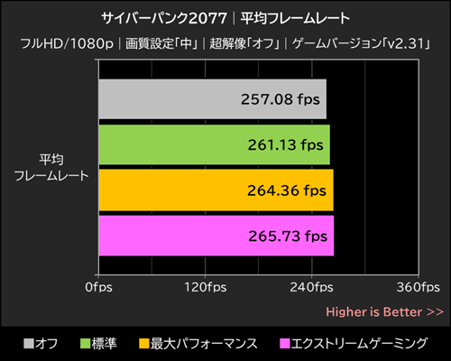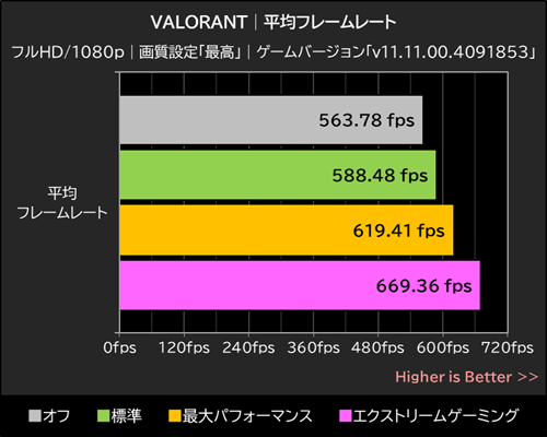 明らかにCPUがボトルネックになるこのシチュエーションでは、標準がオフ時の563.78fpsを約4.4%上回る588.48fpsを記録し、最大パフォーマンスがオフ時を約9.9%上回る619.41fps、エクストリームゲーミングはオフ時を18.7%上回る669.36fpsを記録した。