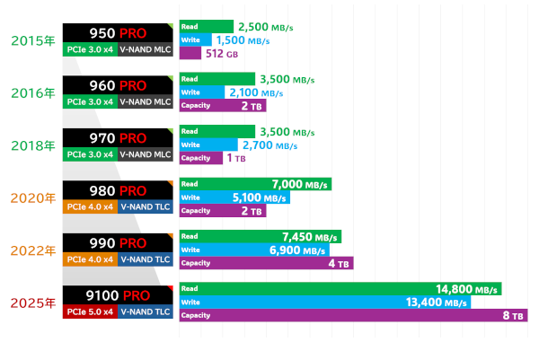 950 PRO発売からの10年間でSSD関連技術は飛躍的な進化を遂げ、バスインターフェイスも950 PROが採用したPCIe 3.0 x4からPCIe 5.0 x4に更新された。その成果として、最新のPCIe 5.0 SSDである9100 PROの最大速度はリード14,800MB/s、ライト13,400MB/sを実現した。また、NANDの高集積化や積層技術の進歩などにより、最大容量も8TB(8,000GB)に到達している。
