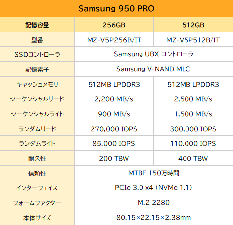 Samsung独自の3D NANDフラッシュメモリ「V-NAND MLC」と自社製造の「UBXコントローラ」を備え、インターフェイスにPCIe 3.0 x4を採用した950 PROは、当時主流の6Gbps SATA(600MB/s)では不可能なリード2,500MB/s、ライト1,500MB/sという最大速度を実現。容量ラインナップは256GBと512GBの2モデルが用意された。