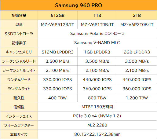 TLCタイプのV-NANDを採用した普及価格帯向けのNVMe SSDである「960 EVO」と同時にリリースされたことで、960 PROは従来よりも性能を追求したSSDとなっており、最大容量の2TBモデルは発売当時に税込み159,800円前後(消費税率8%)という価格が設定されていた。